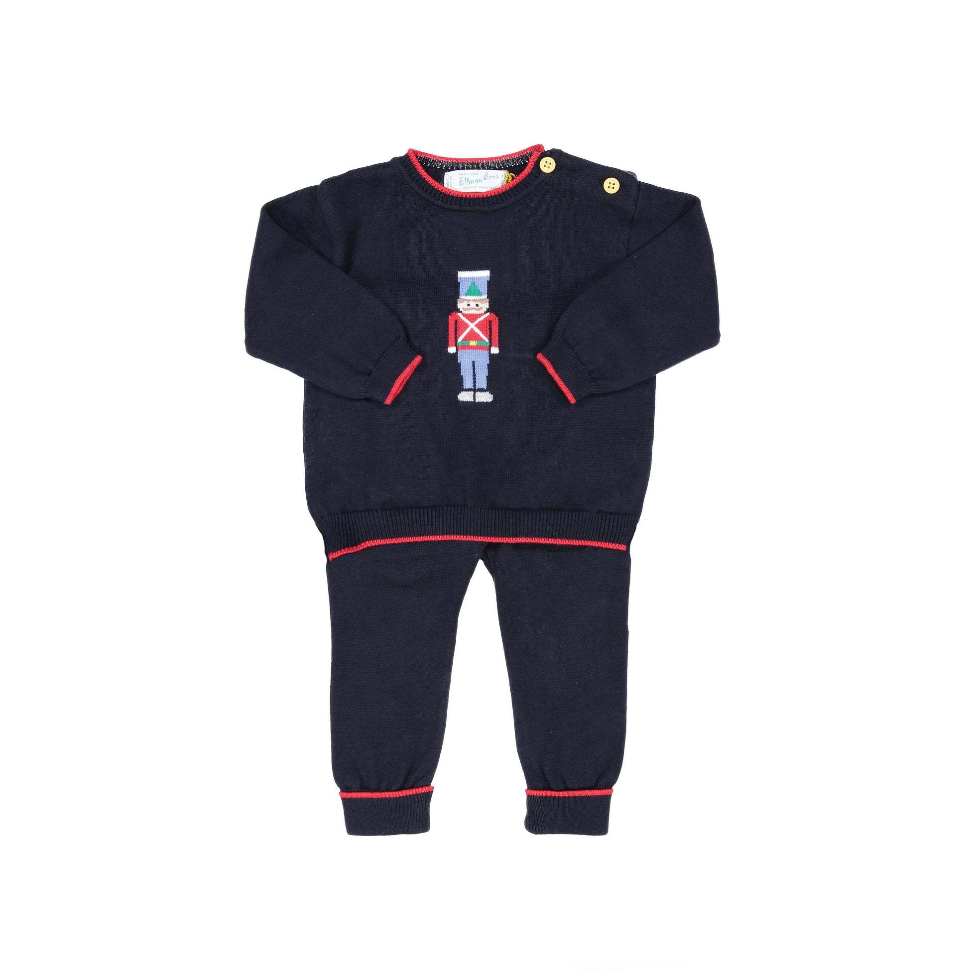 The perfect knit Christmas outfit! Your little prince will be the star of the holiday season in this timeless 2-piece set. Made of warm cotton knit and a classic holiday design. Another timeless knit set from Feltman Brothers for your baby this Christmas!