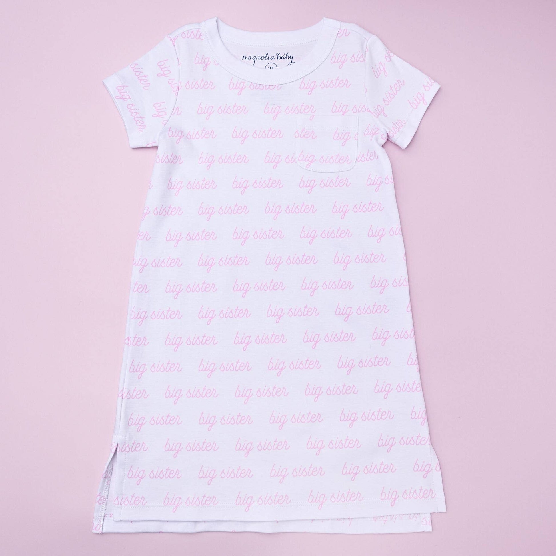 Celebrate the arrival of a new sibling with this nightdress. The all-over "Big Sister" print in pink makes it the perfect way to announce the exciting news. The classic t-shirt design with short sleeves and a relaxed fit ensures ease of movement, while the playful print adds a touch of charm.