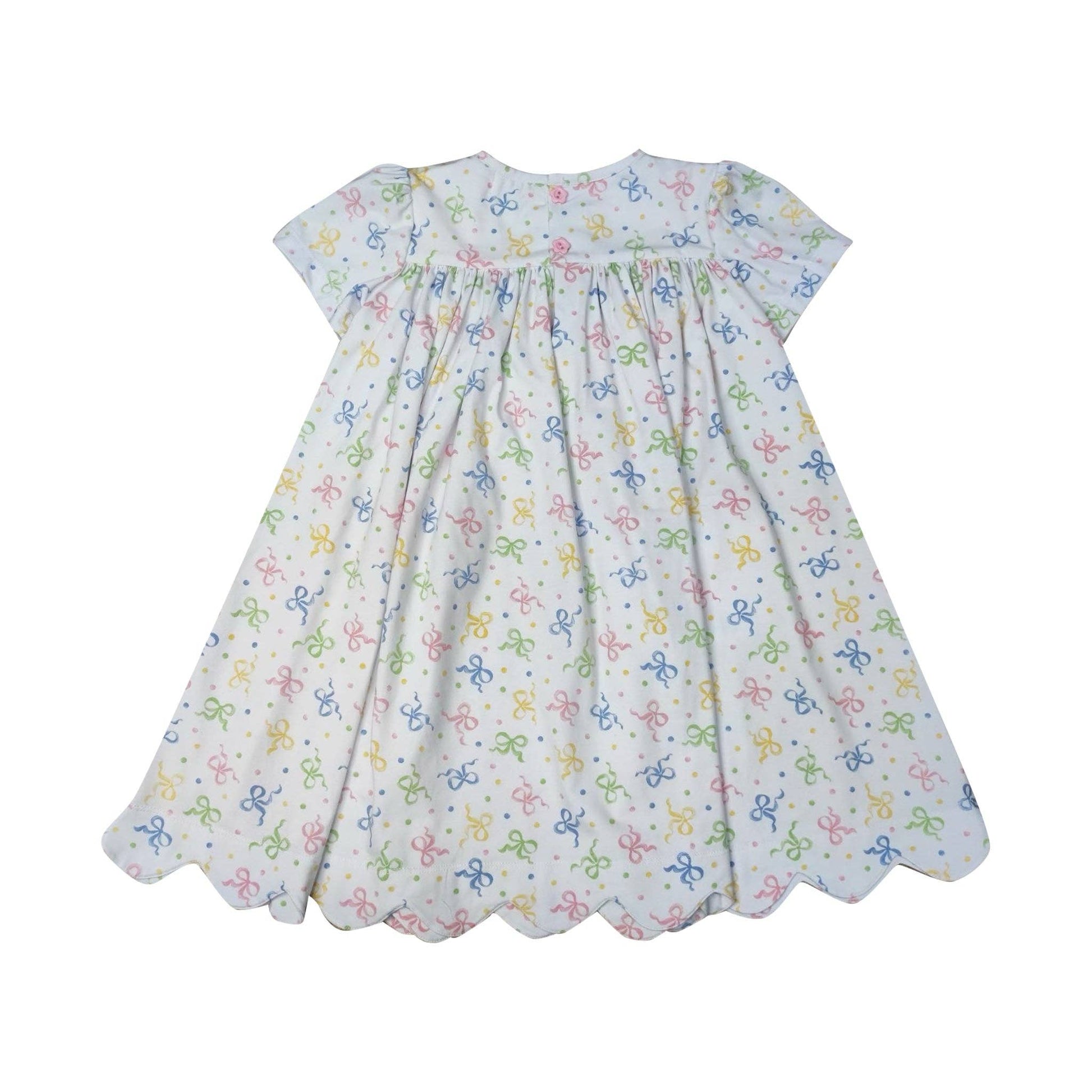 * The dress sports short sleeves and a playful bow print in an array of pastel colors, creating a visually appealing look that captures the freshness of the season.