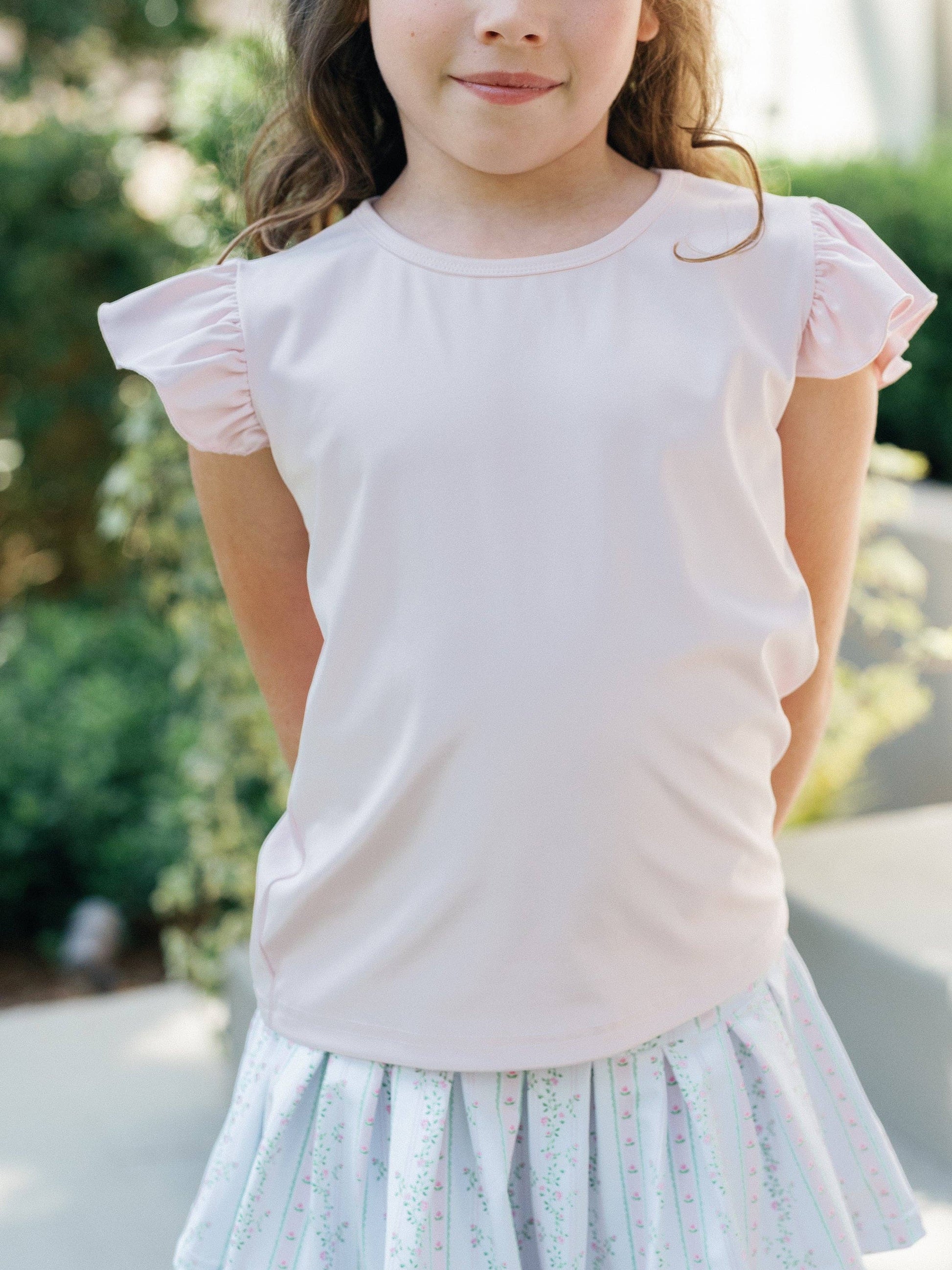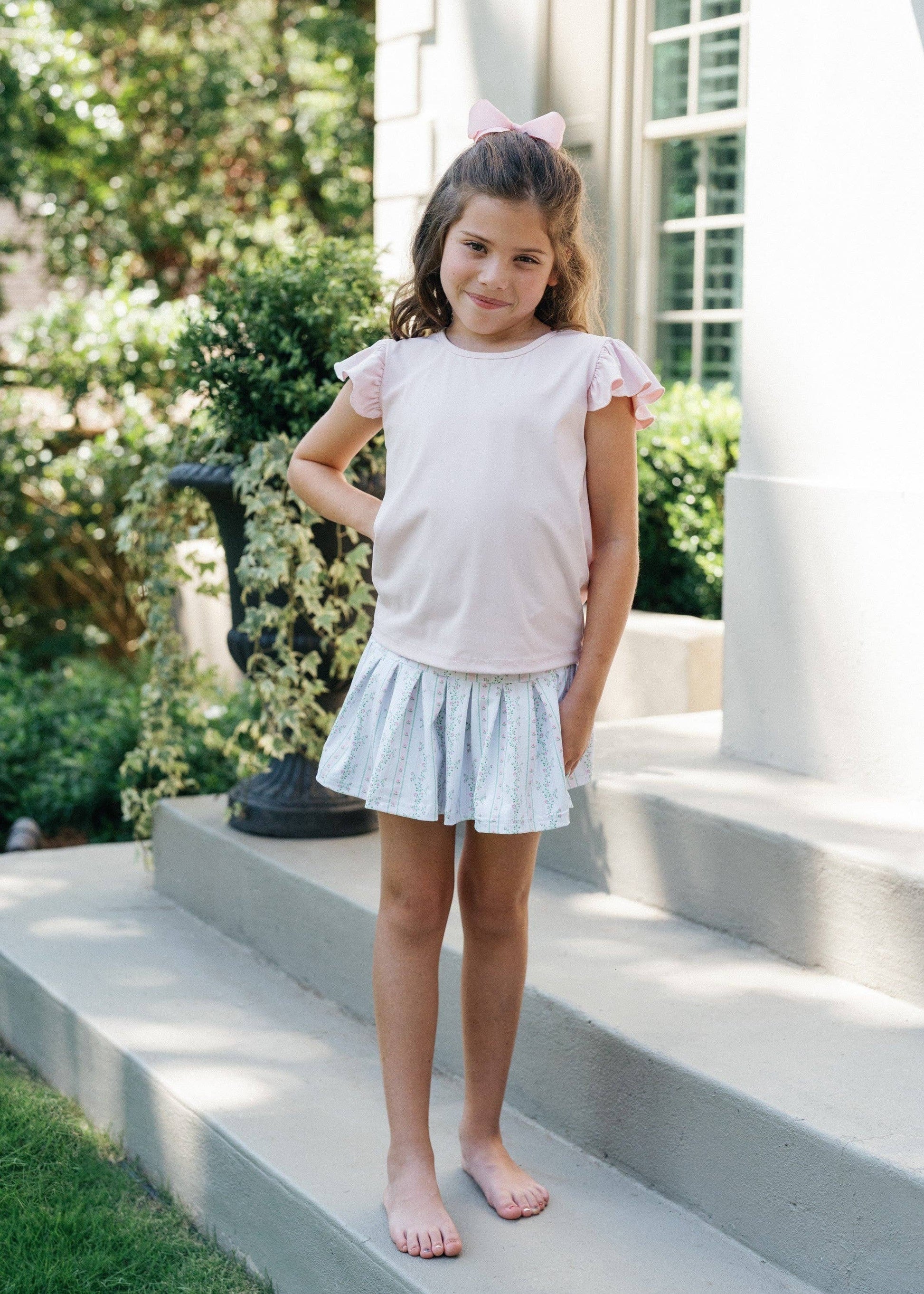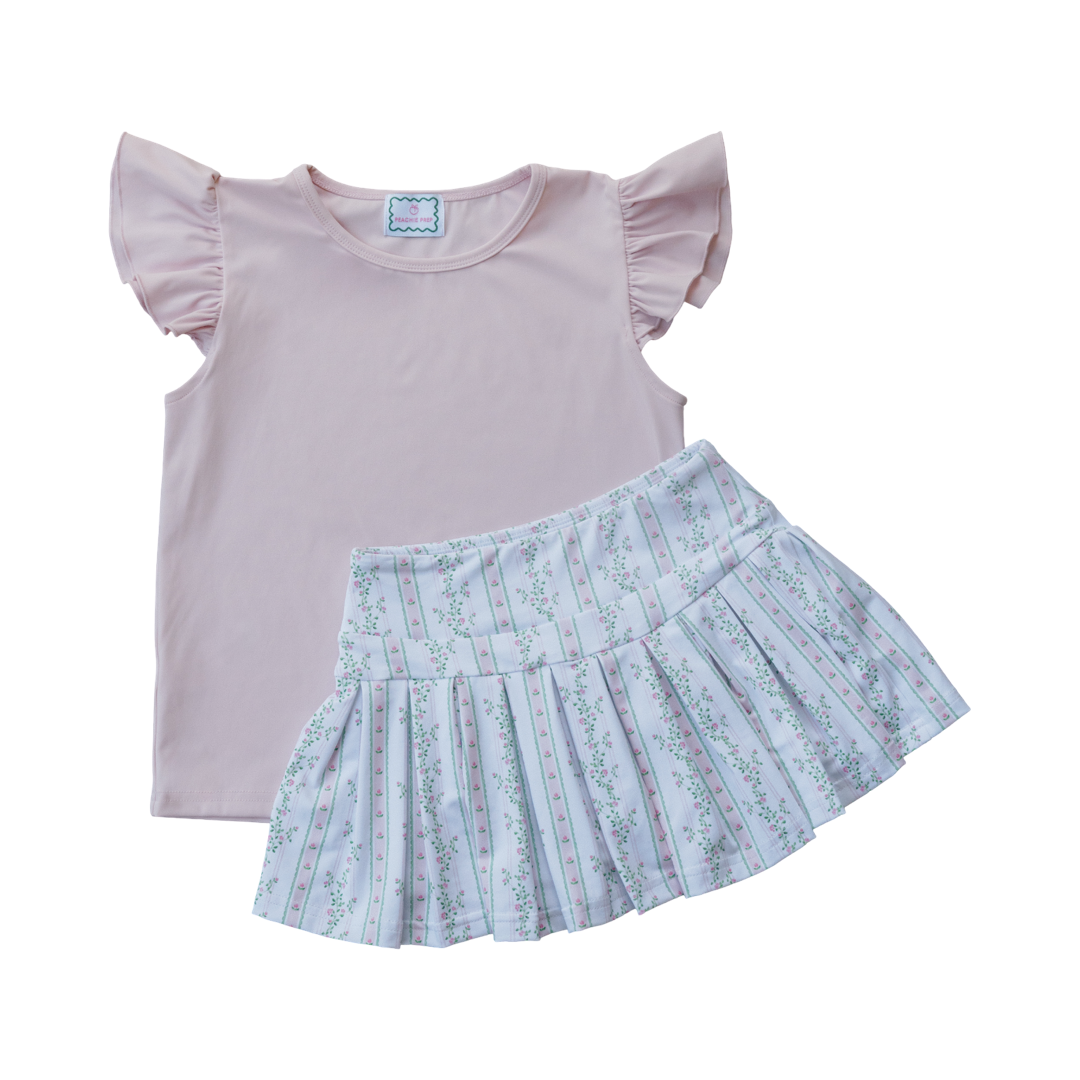 Sweet, simple, and perfect for sunny days — the Collins Set in Pink Trellis is an effortlessly charming outfit for girls on the go. Featuring a soft, light pink flutter-sleeve top and a coordinating pleated skirt in a dainty floral stripe pattern, this set brings together comfort and timeless style.