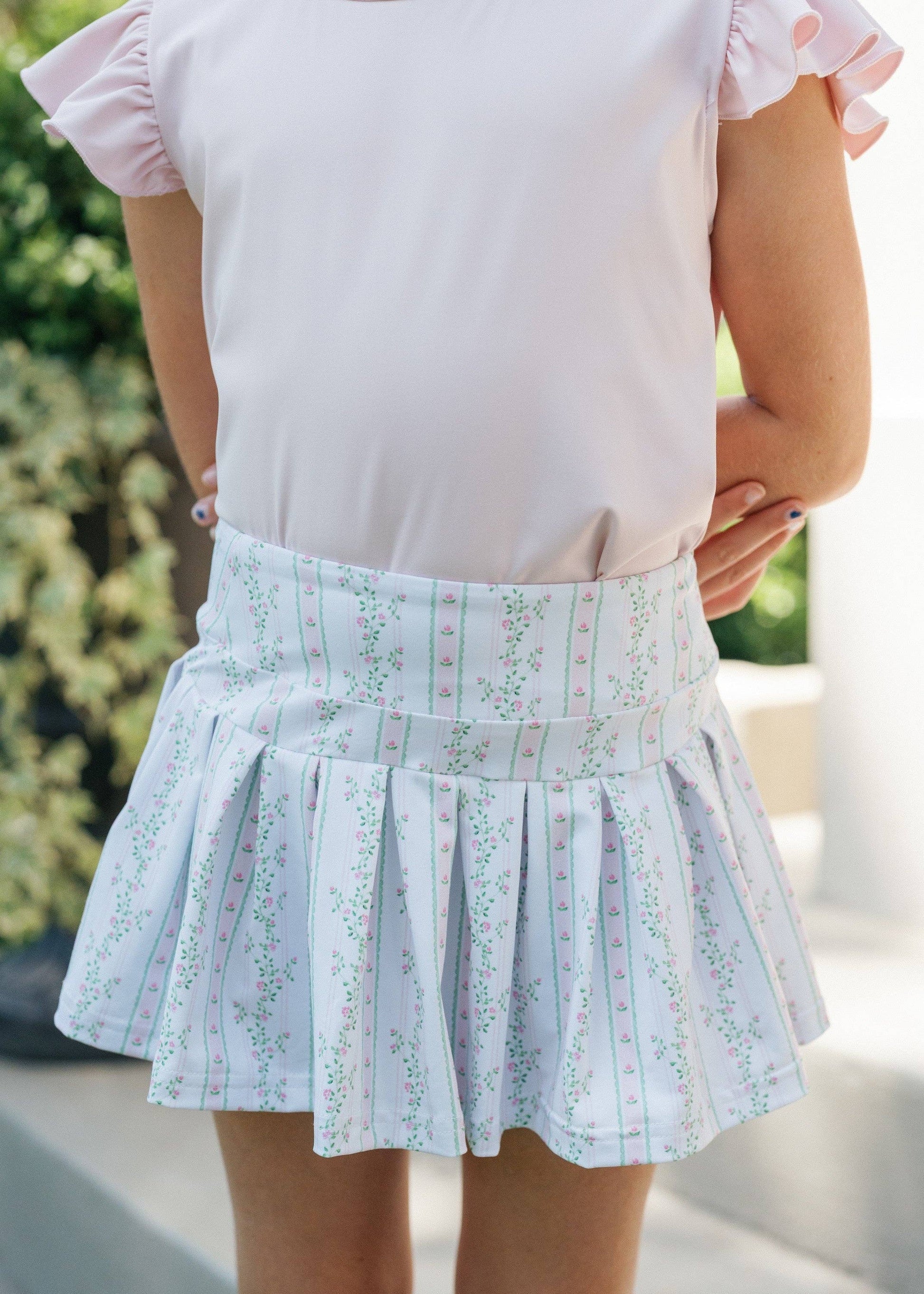 The top is made from breathable athletic material with flutter sleeves for a playful, feminine touch. The pleated skirt adds movement and flair, with soft pink blossoms and green accents dancing down classic vertical stripes — perfect for school, sports or weekend exploring.