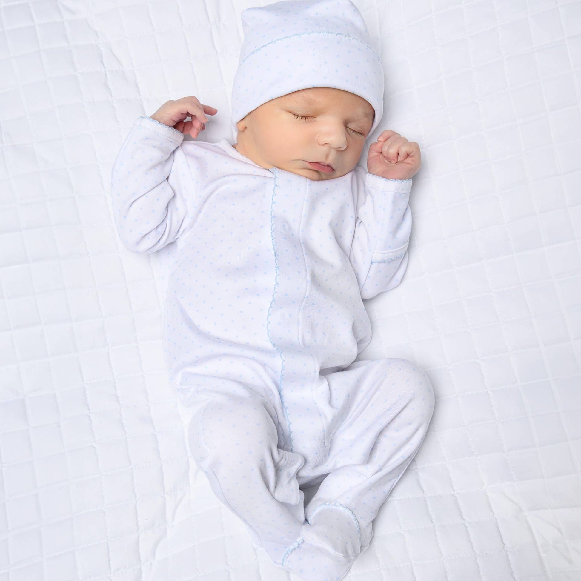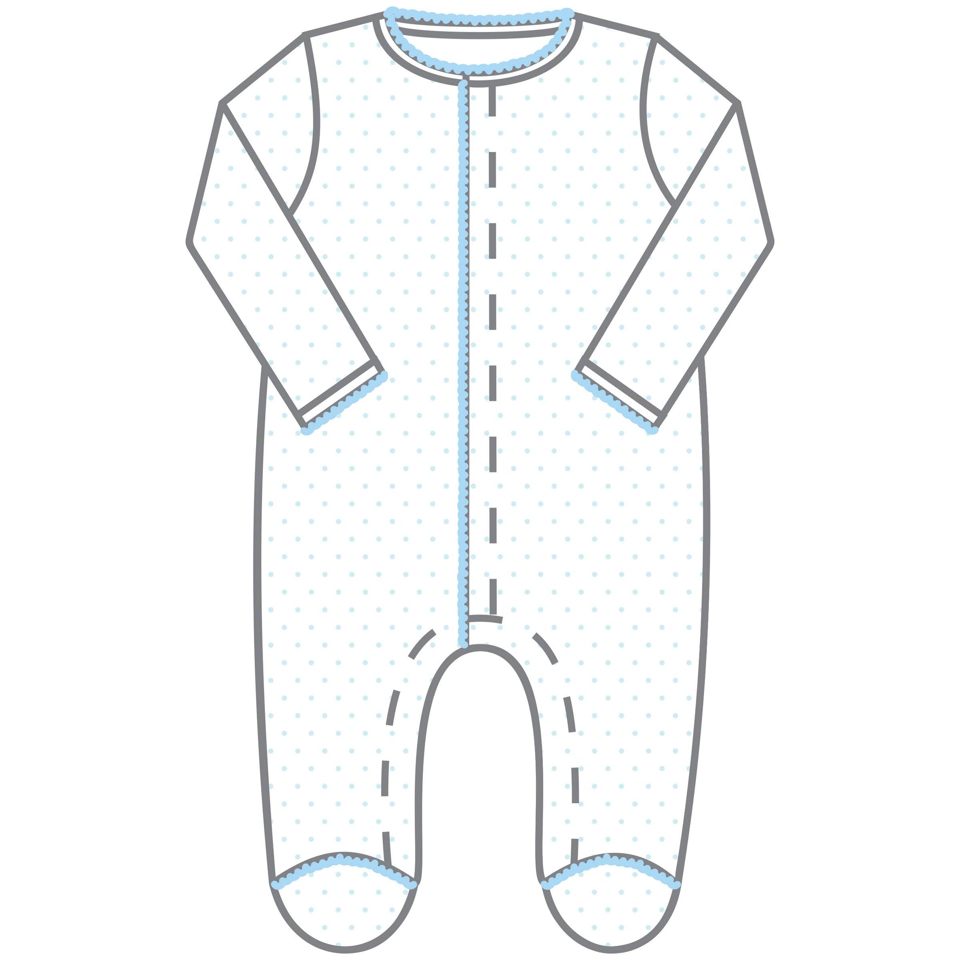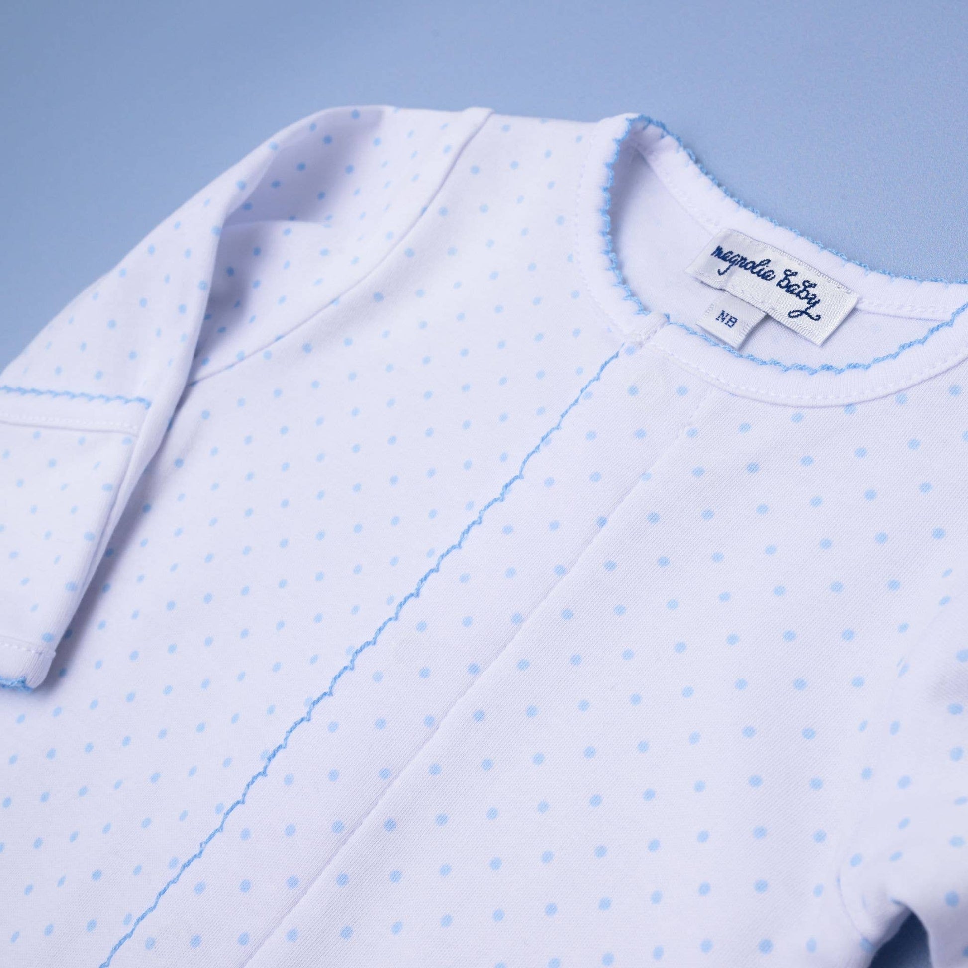 This delightful baby footie is an ideal choice for welcoming a newborn! Crafted from the softest Pima cotton, it is gentle on sensitive skin and showcases lovely light blue picot details along with an all-over mini dot pattern. Perfect for layering or wearing solo, this classic design is a versatile addition to any baby's wardrobe.