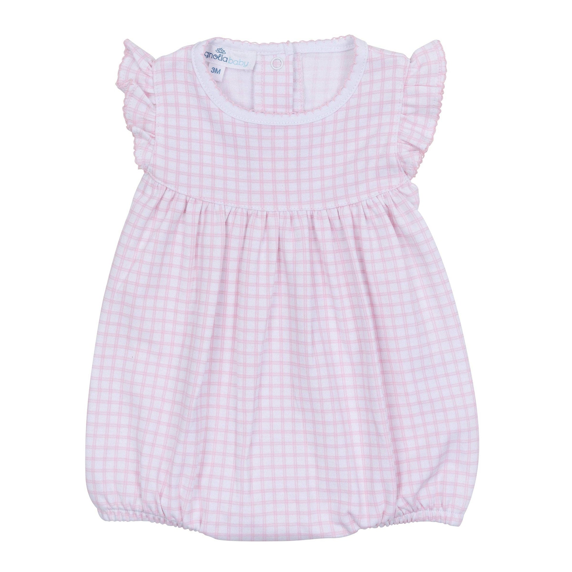 Introducing effortless playtime with our Peek-A-Boo Wishes Bubble in pink, crafted from the most luxurious Pima cotton. This adorable bubble features delicate pink picot trim and a charming check pattern, perfect for spending quality time with family, visiting loved ones, a delightful first adventure at the park, offering a comfortable and unrestricted fit for movement.