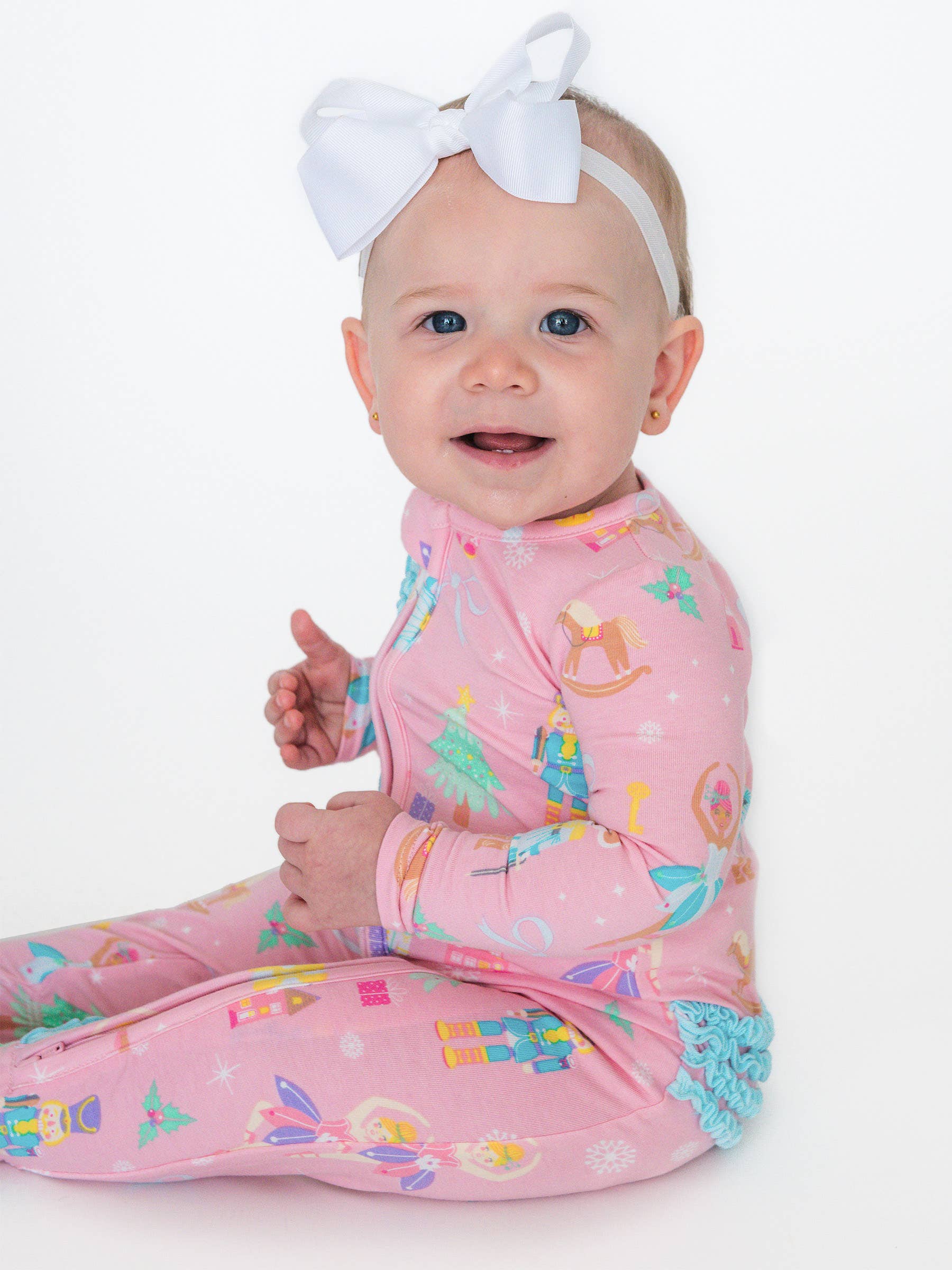 This ruffled sleeper is soft and cozy on baby's skin, with precious ruffles that will bring a smile to your face. A two-way zipper makes changing a breeze, so everyone can get the best night's rest. Grips on the feet will help early walkers have steady footing. Featuring foldover mitts on Newborn and 0-3m sizes. Tagless for added comfort. Made from our premium SoftSnooze™ cotton modal blend, these jammies are super cozy and soft. The snuggly modal fabric is pill-resistant and great for embroidery or personalization!