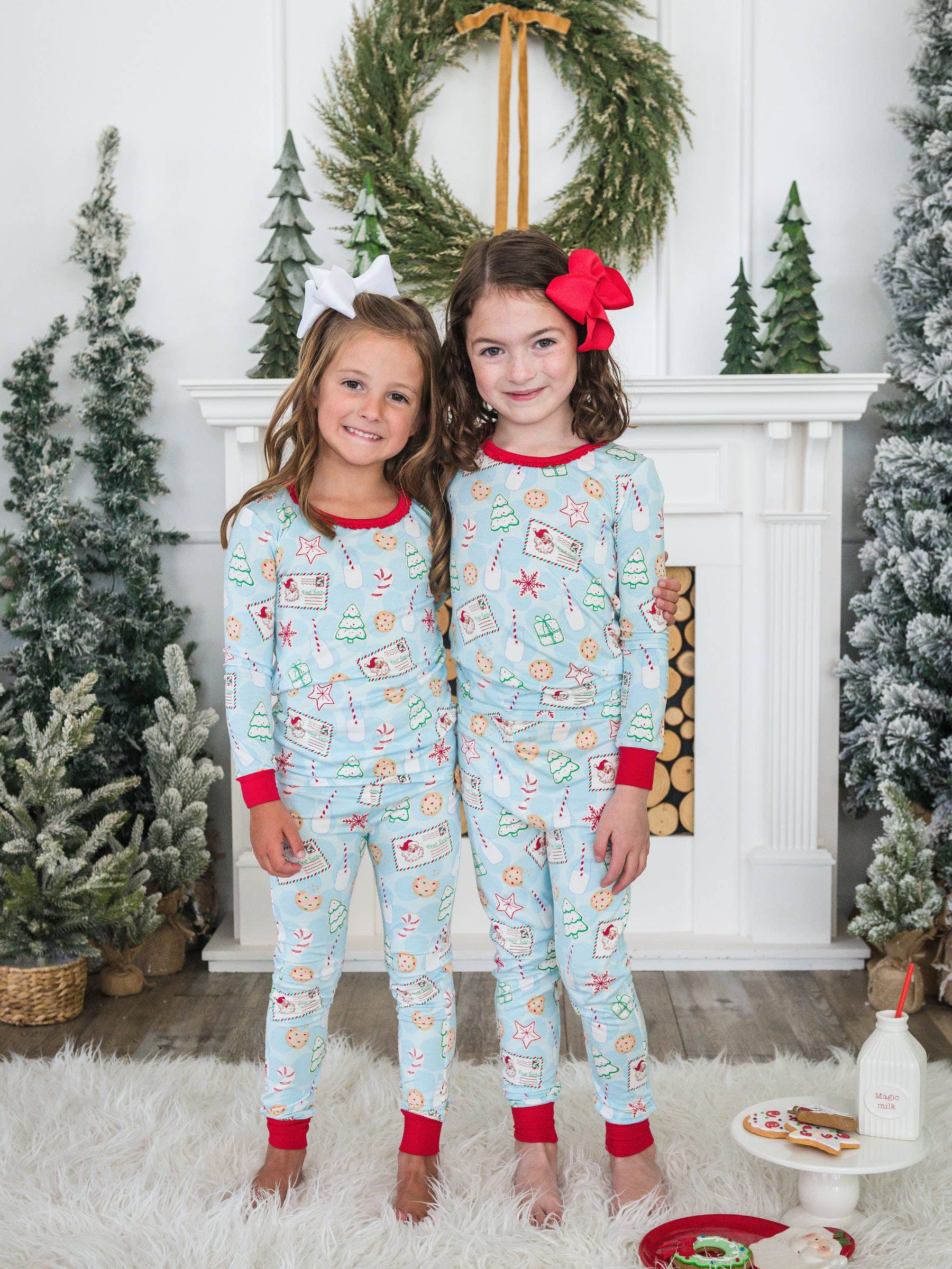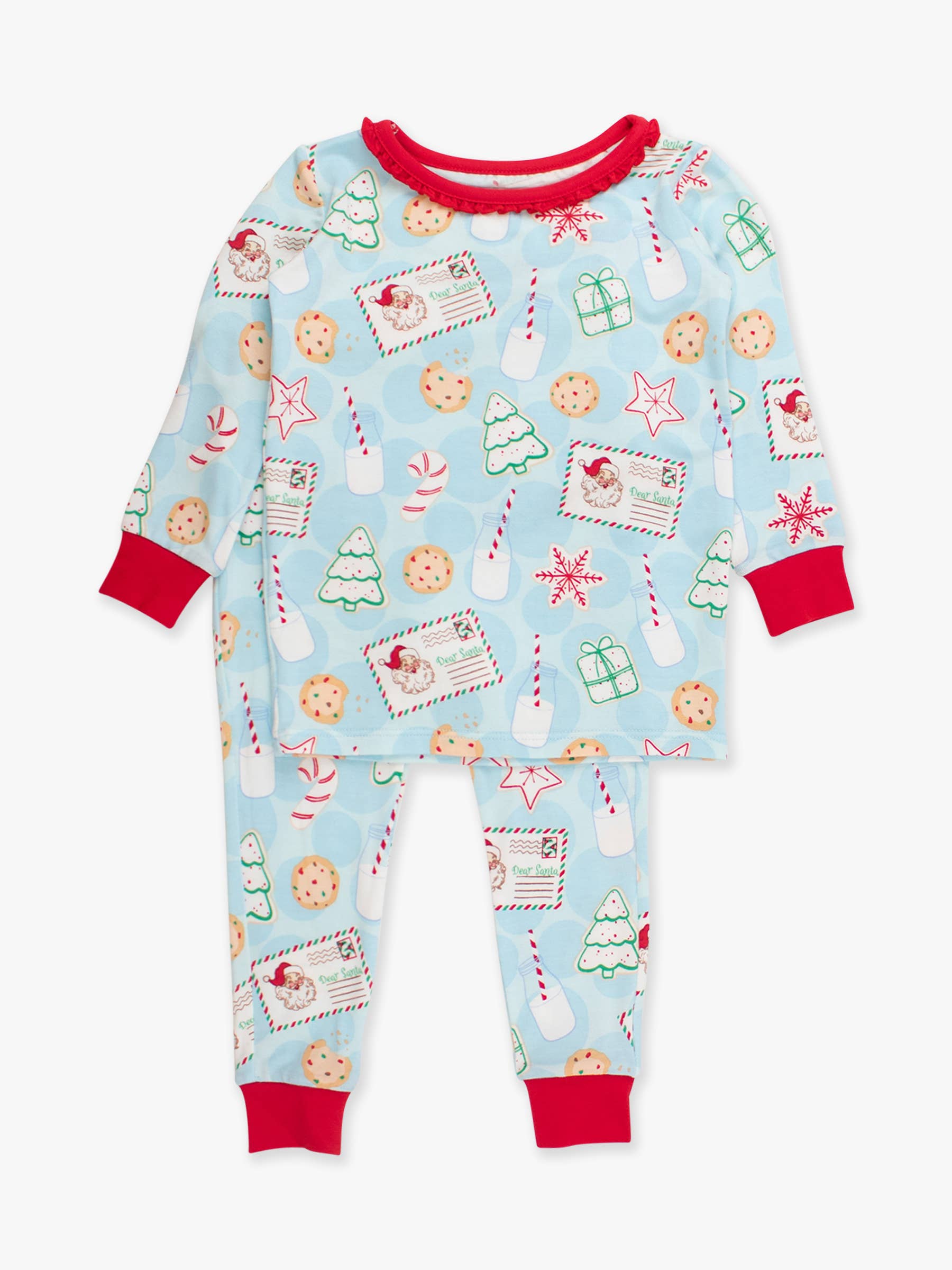 This long sleeve sleep set is soft and cozy, with precious ruffles that will bring a smile to your face. A dainty ruffle adorns the neckline of the pajama top, and classic rear ruffles add the finishing touch. Tagless for added comfort. Made from our premium SoftSnooze™ bamboo viscose fabric, these jammies are super snuggly, breathable, and gentle on sensitive skin. Perfect for keeping cozy in the winter yet cool in the summer. The grow-with-me stretch means growing little ones can wear these pajamas for longer! Get ready for Christmas with milk & cookies & letters for Santa! Pairs well with Blue Breeze, Red, Emerald Green, White. Care Instructions: Machine wash cold inside out; only non-chlorine bleach when needed; tumble dry low Fabric Content: 95% Viscose from Bamboo, 5% Spandex Reference Code: G4616